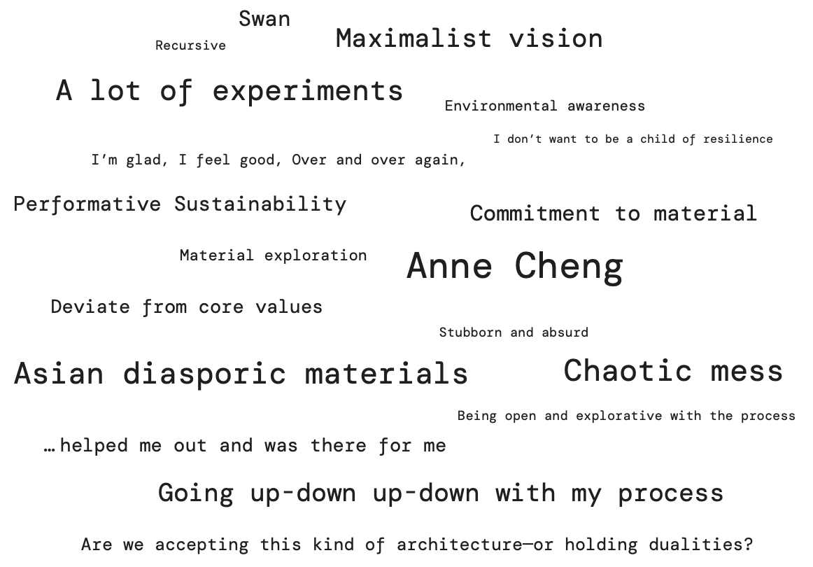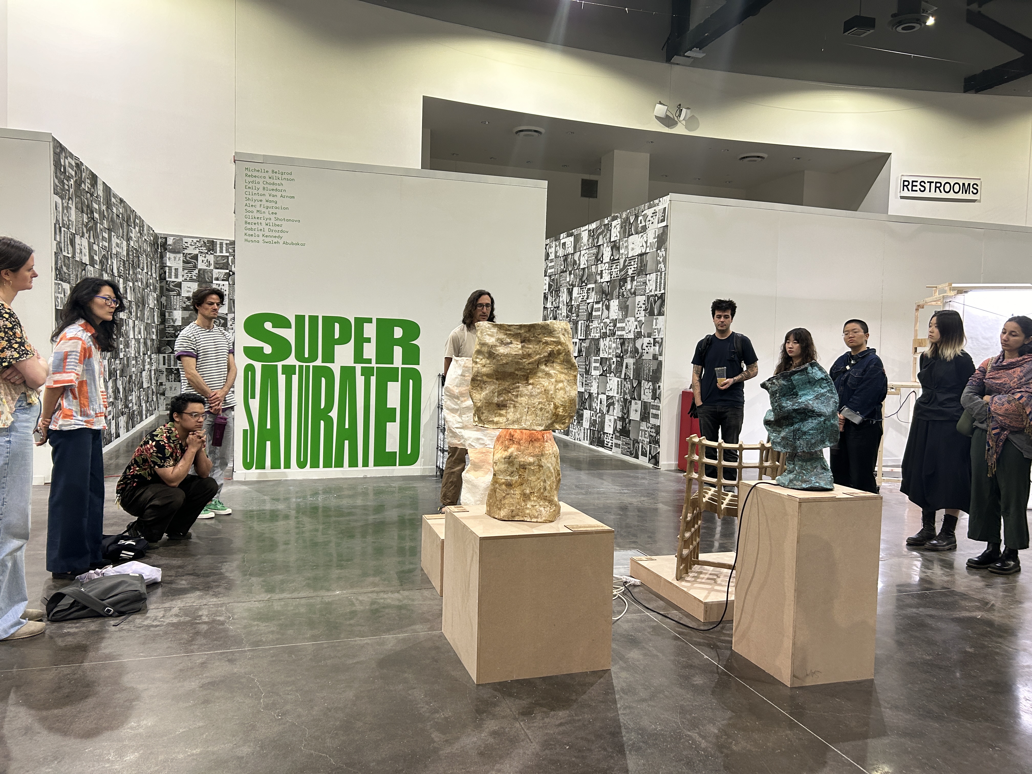 In the days following the opening reception, most of the graduate departments had their final crits in the space, imbuing the exhibition hall with a sense of bittersweet culmination. Once inside the space, my attention was repeatedly diverted as I saw a friend presenting here, another work I wanted to know more about there, and multiple groups moving from work to work together. To keep up, I had to float with the crit clouds, picking up words, phrases, ideas, and the occasional photograph. This is what I came across: