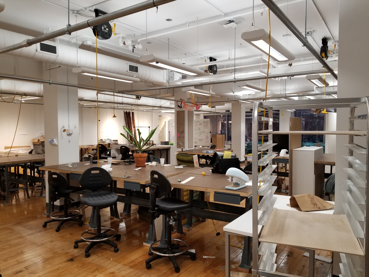 Empty CIT and current Zoom background. Photo by the author.Things happened impossibly fast before becoming impossibly slow, like Time making up for lost time. As the dust settles and I’m sitting indefinitely alone at home, I miss my cohort’s multi-textured piles of collective debris and semi-biological experiments lined up by the window in various stages of growth/decay. I miss the brazen agency that comes with being freshly trained and over-equipped. Because of course, the loss of studio is the loss of the lathe, the laser cutter, the jacquard, the forge, the CNC, the kiln, the letterpress, the darkroom, the tablesaw, even the damn whiteboard and spare pliers—every big and small tool for making. But the loss of studio is also the loss of a culture, which is why the work we finish will not be the work we started.